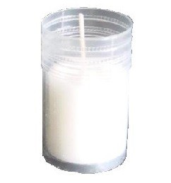 Žvakė (įdėklas) plastmasinėje pakuotėje, degimo laikas 18val., aukštis - 4.5cm, diametras - 45mm, parafino kiekis 60g.