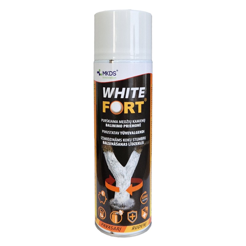 NAUDOJIMAS: prieš naudojimą sukratykite. Nuvalykite nuo kamienų samanas, kerpes, žievės atplaišas - jas utilizuokite. Medelius balinkite rudenį - kai sausa, esant teigiamai oro temperatūrai, o jei nespėjote - anksti pavasarį. Rekomenduojame padengti visą medžio kamieną nuo šaknies kaklelio iki pirmosios skeleto šakos plonu White Fort sluoksniu. Purškiant pasirinkite tinkamą atstumą, kad taupiai pasidengtų kamieno paviršius. Prieš naudodami visuomet perskaitykite etiketę ir informaciją apie produktą.