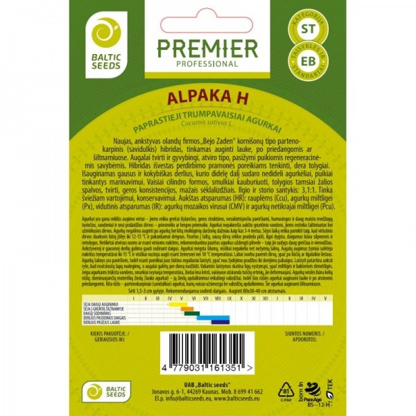 Augalai tvirti ir gyvybingi, atviro tipo, pasižymi puikiomis regeneracinėmis savybėmis. Hibridas išvestas perdirbimo pramonės poreikiams tenkinti, dera tolygiai. Aukštas atsparumas (HR): rauplėms (Ccu), agurkų miltligei (Px), vidutinis atsparumas (IR): agurkų mozaikos virusui (CMV) ir agurkų netikrajai miltligei (Pcu). Sėklos beicuotos. Sėklų kiekis (vnt): 20vnt