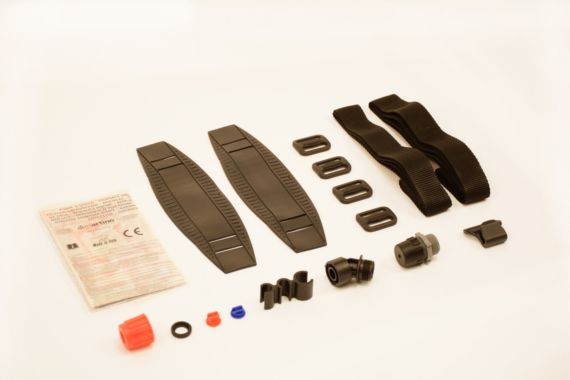 Komplekte: diržai, 3 purkštukai, kampinė 45° alkūnė. diržai, tarpinės, laikikliai ir kt.