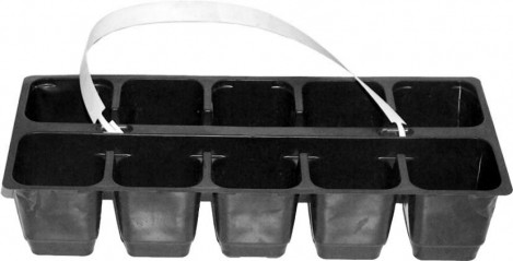 Plastikinė daigykla, 10 narelių (2x5 narelių), daigyklos išmatavimai: 31.5x13.1cm, narelio išmatvimai: 5.6x5.6x6.6cm.