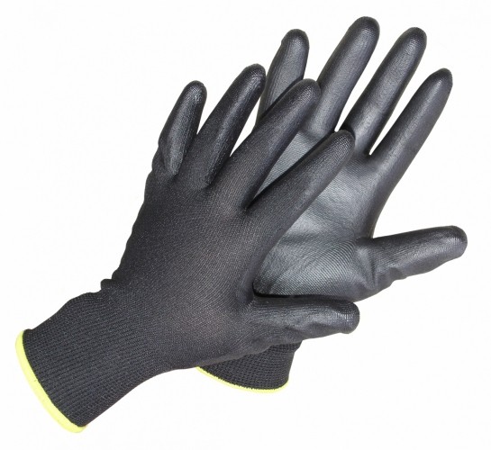 Pirštinės nailoninės, aplietos poliuretanu PU EKO, juodos (9 dydis)